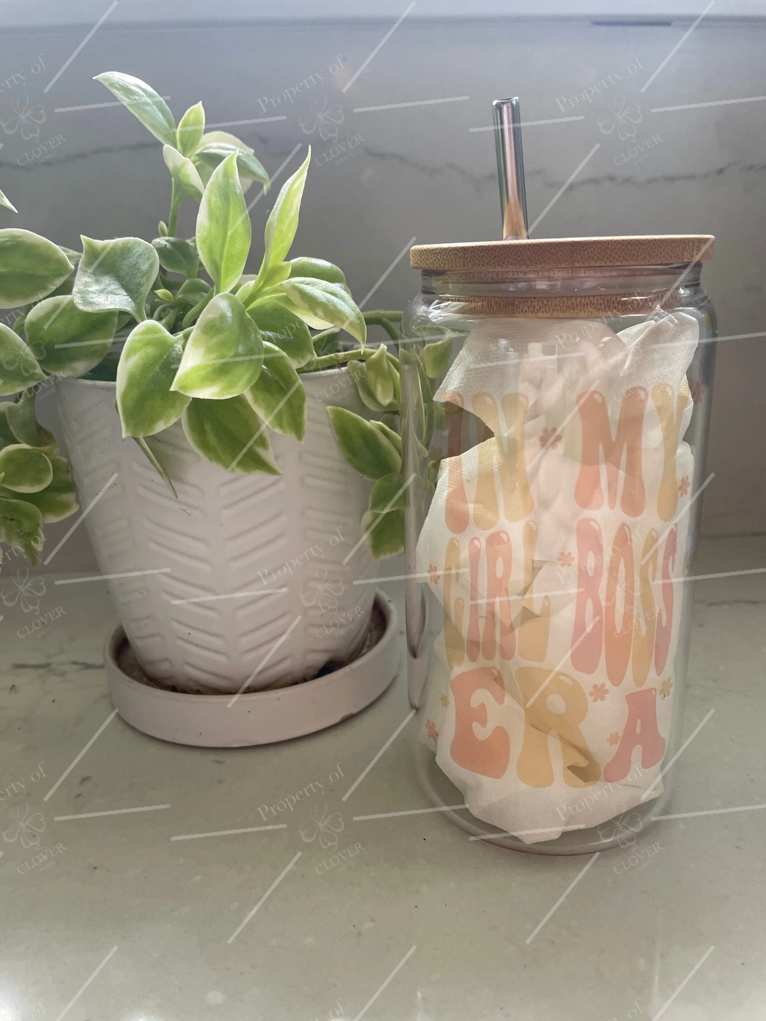 16 oz. glass sublimated with a near-permanent inked design on both sides. Comes with a corresponding straw and bamboo lid.