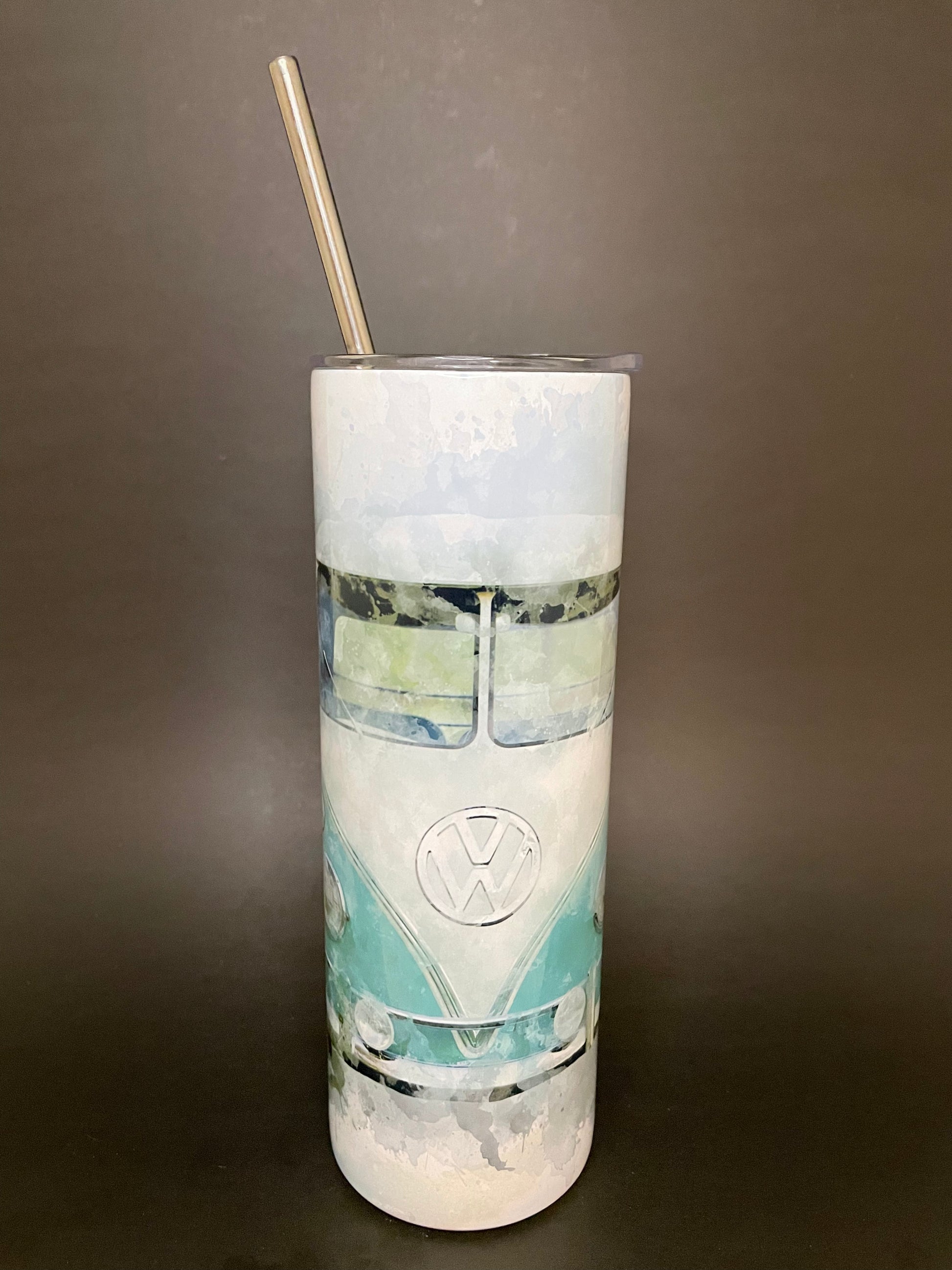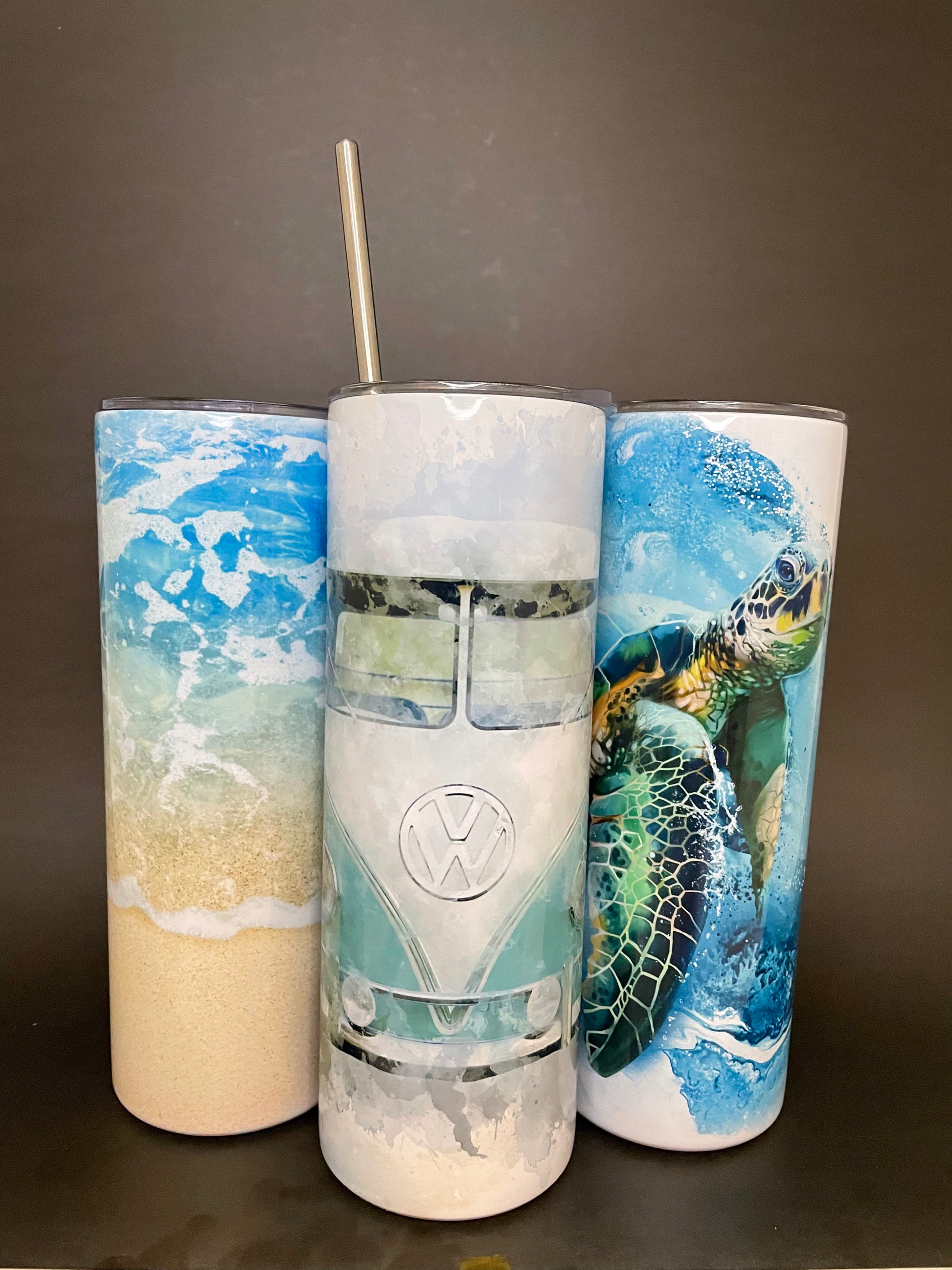 Stainless steel straight tumbler sublimated with a permanent inked design. Comes with a stainless steel straw as well as a non-skid rubber grip on the bottom of the tumbler.