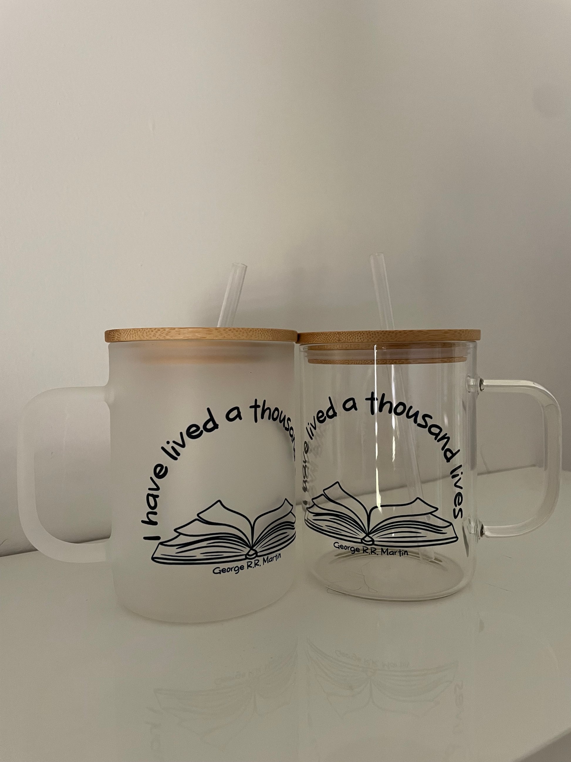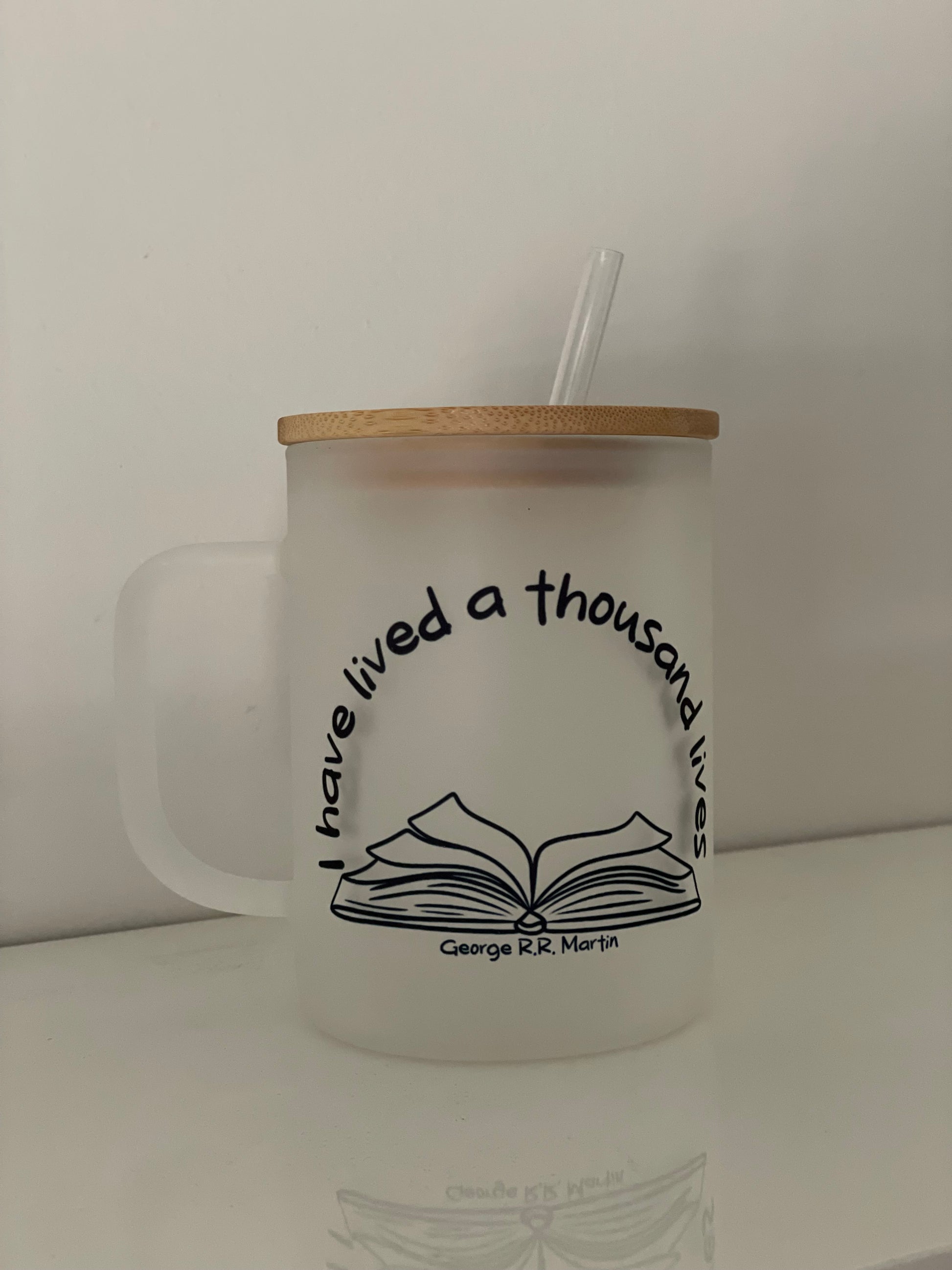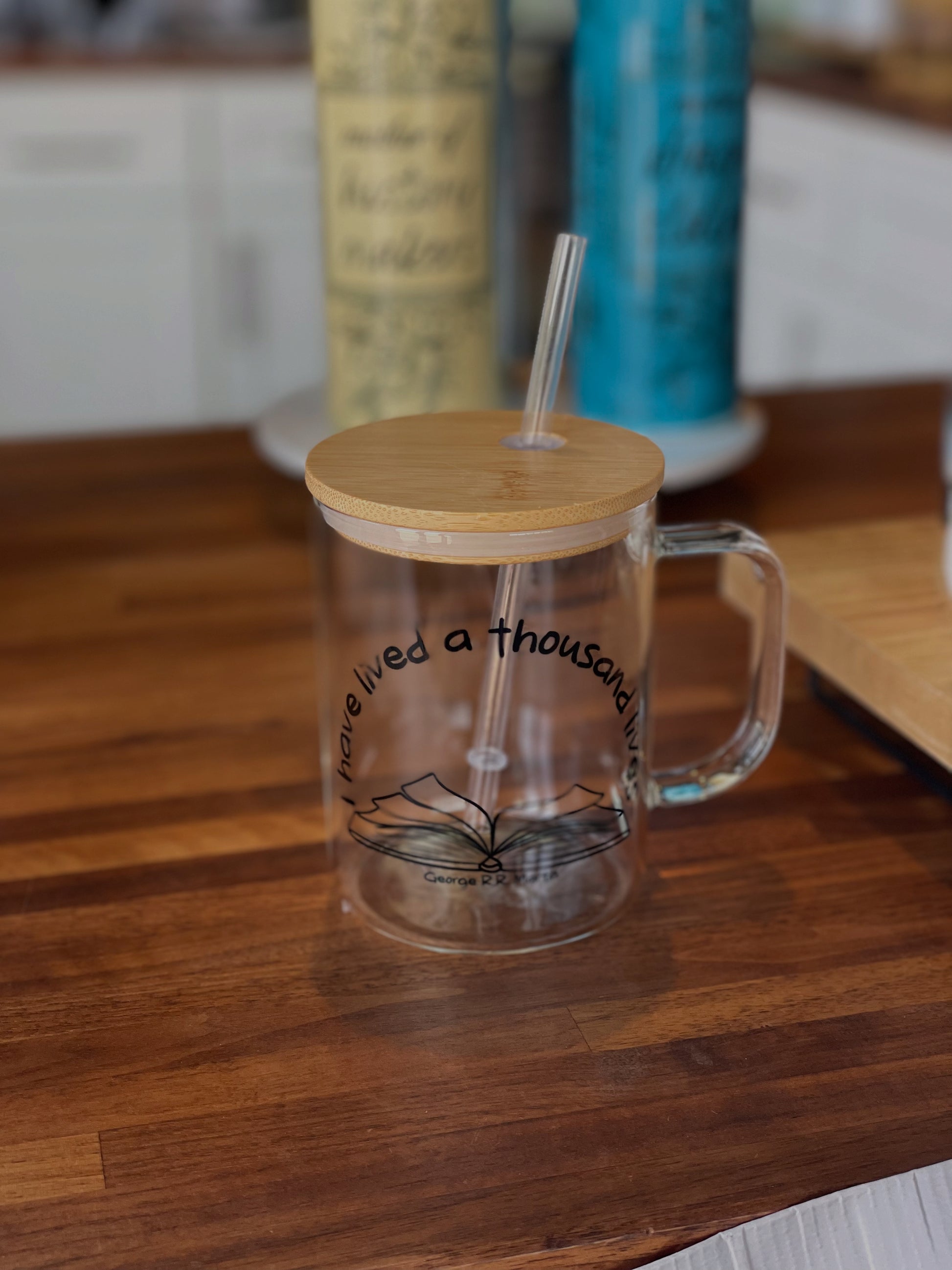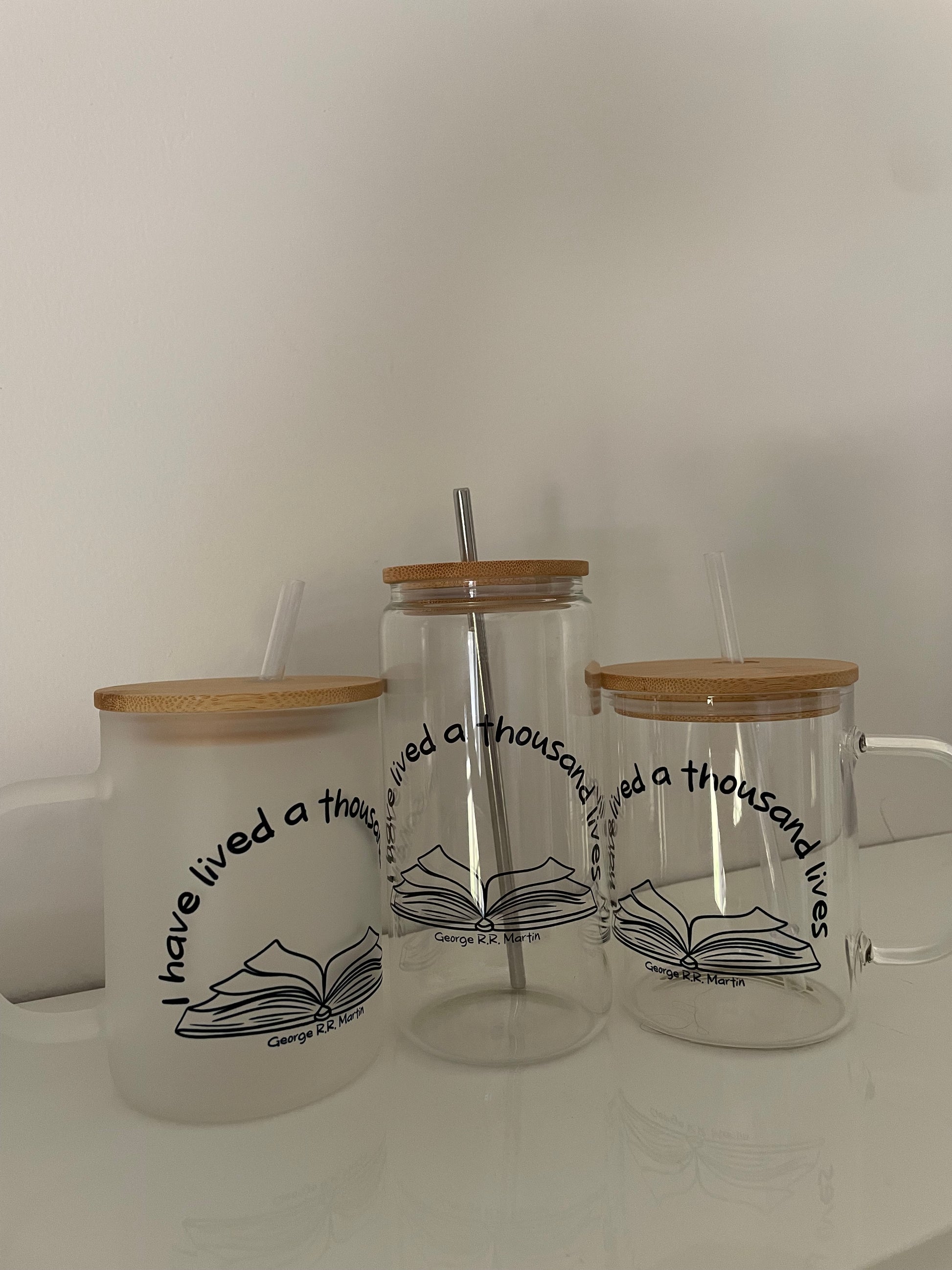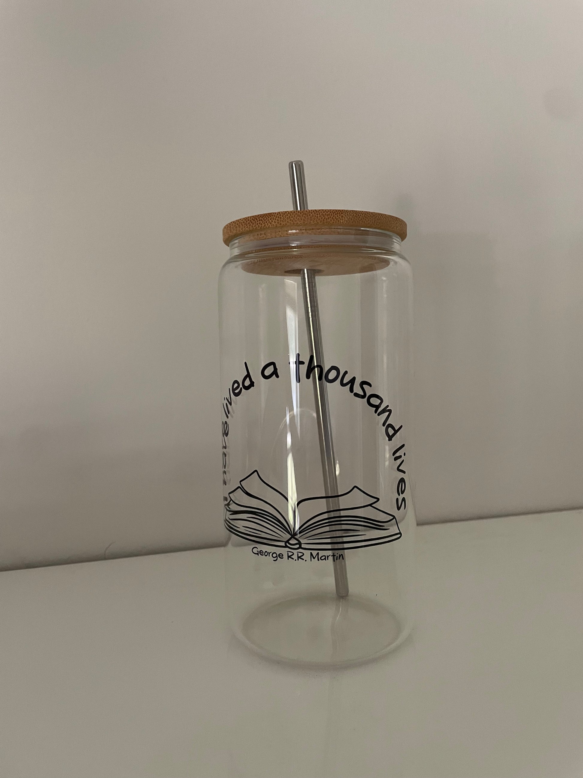 Glassware sublimated with a near-permanent inked design. Comes with a corresponding straw and bamboo lid.